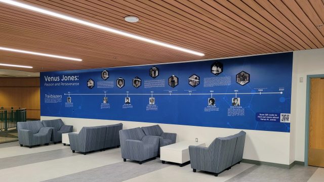 Dimensional wall mural, on display at the Jepson Science Center, featuring the life and accomplishments of Venus Jones, as well as Black women in STEM. Click here to learn more